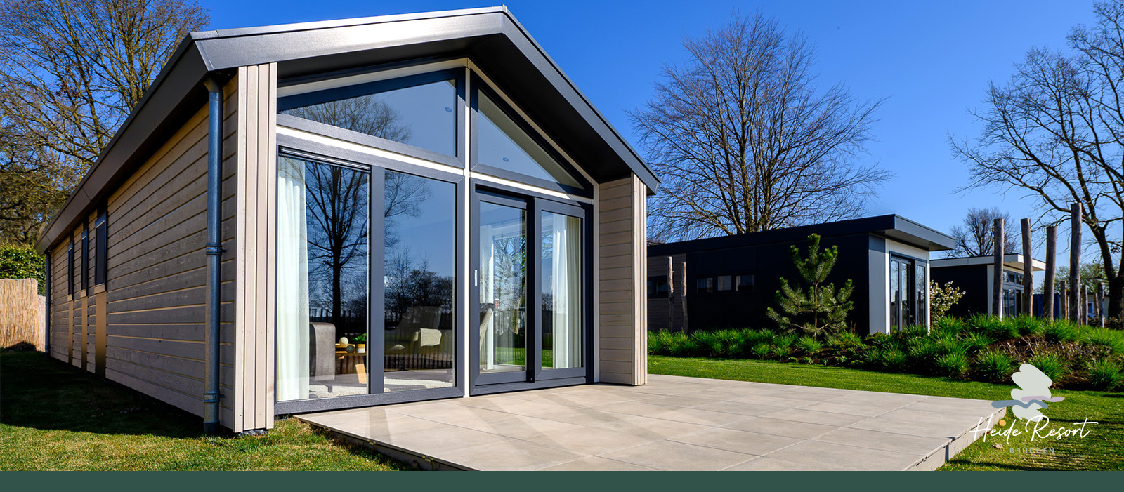 Das Ferienhaus Charleston überzeugt mit einem klassischen Satteldach und einem klar strukturierten Grundriss. Modernes Tiny-House-Feeling trifft auf eine große Fensterfront, die viel Licht ins Innere bringt. Zwei Schlafzimmer, eines mit Doppelbett und eines mit Etagenbett, bieten genügend Platz für Familie und Freunde.